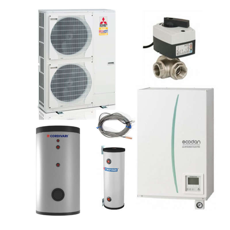 Pachet pompa de caldura aer-apa, split, Mitsubishi Zubadan, 23 kW trifazata, incalzire/racire/ACM, tip hidrobox + boiler + acumulator 100L + vana 3 cai