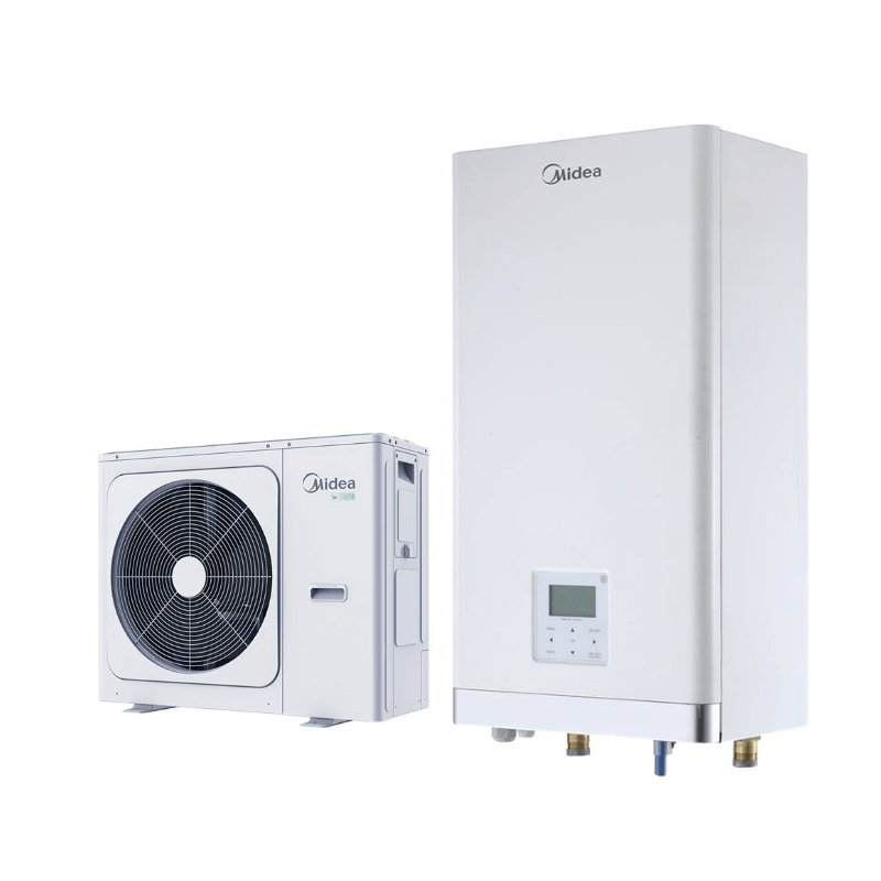 Pompa de caldura aer-apa, splitata, reversibila, cu functie de incalzire si racire.